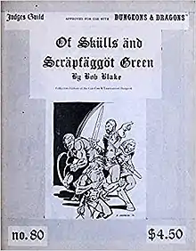 Of Skulls and Scrapfaggot Green was written by Bob Blake, and was published by Judges Guild in 1978 as a 52-page book.[1] Judges Guild published a second edition in 1980.[1]