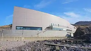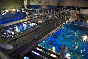 Overlooking the Sea of Japan, it keeps and displays over 10,000 marine organisms, including those from Akita Prefecture's abundant marine resources and over 400 species of rare aquatic animals from around the world. This is the only tank in Japan where they have Japanese sandfish on display all year round.[7] They also have a touch pool section where you can handle different sea creatures, such as sea urchin and sea cucumbers.[8][9] During the New Year’s season, divers dress up as Namahage and feed the fishes in the main tank.[10][11] The aquarium has appeared in the film "Tsuribaka Nisshi 15".[12]