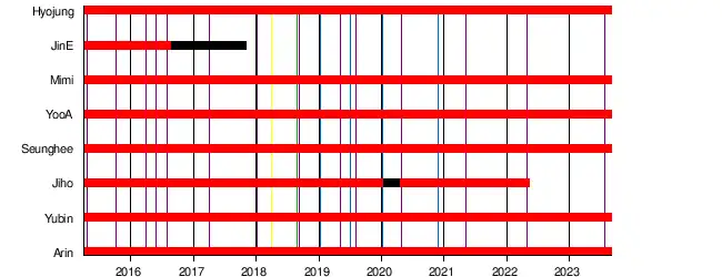 Oh My Girl (Korean: 오마이걸; RR: Omaigeol, stylized in all caps or OMG) is a South Korean girl group formed by WM Entertainment. The group is composed of six members: Hyojung, Mimi, YooA, Seunghee, Yubin and Arin. Originally an eight-piece group, JinE left the group in October 2017 due to health issues, and Jiho left in May 2022. Oh My Girl debuted on April 20, 2015, with an eponymous extended play.[2][3]