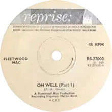 Instead of including "Oh Well" on the UK track listing of Then Play On, the label chose the song as the band's next single, which came as a surprise to the song's writer, Peter Green, who expected Kirwan's "When You Say" to receive that designation.[9] Hesitant to release "Oh Well (Part 1)" as a single, Green lobbied to make "Oh Well (Part 2)" the A-side instead, but to no avail.[4] Fleetwood and McVie bet Green eight pounds apiece that "Oh Well" would flop, but the single instead went on to chart in several territories.[10]