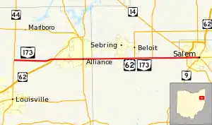 State Route 173 (SR 173) is located in northeastern Ohio, and runs eastwest from State Route 44, about 4 miles (6.4 km) north of Louisville, Ohio to State Route 14 and State Route 9 in downtown Salem, Ohio. It primarily passes through Stark and Columbiana counties, though it also straddles the county line between Mahoning County and Columbiana County for some of its length. Much of the route is also run in concurrency with U.S. Route 62.