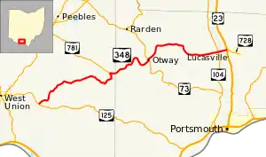 State Route 348 (SR 348) is an east–west state highway in the south central portion of the U.S. state of Ohio. Its western terminus is at State Route 125 approximately 6 miles (9.7 km) east of West Union, and its eastern terminus is at U.S. Route 23 just north of Lucasville – this is also the western terminus of State Route 728.