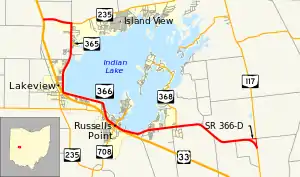 SR 366 starts at US 33 at a T intersection, north of Lakeview. It moves east, meets SR 235, and becomes concurrent one mile later. SR 235/366 moves south and intersects SR 365 half a mile later. The concurrency parallels the shore of Indian Lake until SR 235 splits off in Lakeview. Continuing to parallel the shore, SR 366 turns east near US 33. After a bit more than one mile, SR 366 enters Russells Point, and it intersects SR 708 as it heads southeast. In downtown Russells Point, SR 366 is only few yards from US 33. Later, SR 366 leaves Russells Point and intersects SR 368, who provides access to islands in the lake. The route continues east, and then moves south on a ramp to SR 117 south, the terminus of SR 366. SR 366D provides access to SR 117 north and an alternative to SR 366's terminus.[1]