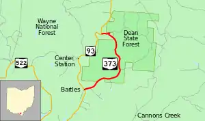 State Route 373 (SR 373) is north–south state highway in the southern portion of Ohio. Its southern terminus is just over eleven miles (18 km) north of Ironton at SR 93 at the hamlet of Bartles, and its northern terminus is at about three miles (4.8 km) to the north of its southern terminus, also at SR 93.