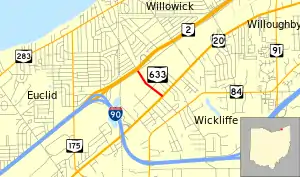 The 1923 Ohio Department of Highways map shows a road running along the corridor of modern SR 2 from Cleveland to Wickliffe, then turning south along the route of Lloyd Road to US 20 in Wickliffe.[5] This routing is designated as a state highway by the 1932 map.[6] On the 1939 map, the northeast–southwest road, now labelled as SR 2, is extended eastward, but the Lloyd Road section is still designated as a state highway.[7] Starting with the 1940 Lake county map, this segment is labelled SR 633.[8][9] In approximately 1963, SR 2 is rerouted onto the Lakeland Freeway,[10] but SR 633's terminus remains at Lakeland Boulevard.[11][12]