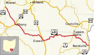 State Route 681 (SR 681) is a 39.53-mile (63.62 km) long eastwest state highway in the southern portion of the U.S. state of Ohio. The western terminus of SR 681 is at a T-intersection with SR 356 approximately 6.75 miles (10.86 km) northwest of Albany. Its eastern terminus is also at a T-intersection, this time with SR 124 nearly 9.50 miles (15.29 km) southeast of Coolville.
