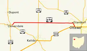 SR 694 begins at an intersection with SR 114 on the bank of the Auglaize River. The route heads north as a two-lane highway, passing through woodland and farmland. The road turns due east passing through farmland, with some houses. The highway has an intersection with SR 115 in rural Putnam County. East of the intersection the route passes a golf course and a few houses, before returning to passing mostly farmland. SR 694 curves northeast and enters the village of Glandorf. The road turns southeast and passes through industrial and residential properties. The route curves due some and has an intersection at U.S. Route 224 (US 224). This intersection is the eastern terminus of SR 694.[2][3][4]
