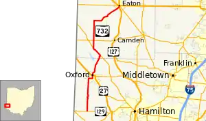 State Route 732 (SR 732) is a state highway in the U.S. state of Ohio. This two-lane state route begins at SR 129 (Hamilton-Scipio Road) in Butler County, and extends northward to end at the junction of U.S. Route 127 (US 127) and US 35/SR 122 in Eaton in Preble County, Ohio, traveling 30.94 miles (49.79 km).[1]