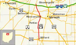 State Route 99 (SR 99) is a north–south state highway in the north-central portion of the U.S. state of Ohio. The highway's southern terminus is in the southern end of Willard at a T-intersection with U.S. Route 224 (US 224). Its northern terminus is at a roundabout junction with SR 4 about 6 miles (9.7 km) southwest of the city limits of Sandusky.
