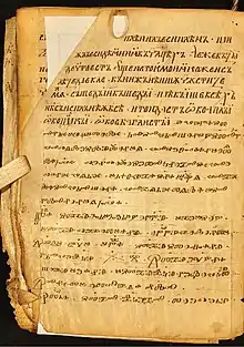According to the majority of scholarly consensus, it was written sometime in the 12th century, but Russian historian Anatoly Turilov dates it between 1225 and 1227, during the reign of Archbishop Demetrios Chromatenos.[1] There are 112 leaves of parchment, and it was written in Cyrillic, with Glagolitic entries by a chief scholar and several assistant writers.[2]
