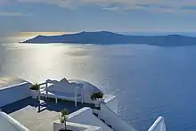 The village is located on top of a hill, at about 150 m (500 ft) elevation, and known as the "Eagles nest" from where Palia and Nea Kameni volcanoes are seen and also the island of Therasia. It is situated to the north of the island and Fira is at distance of 11 km (7 mi).[13] The main street in the town, in the central square, is the main trekking path which is cobbled, called the "Nikalaou Namikaou", which goes up the hill winding round the caldera. The island is reached from Fira which is the transport terminus of the island.[6][14] Caldera boat cruise options are available from either Oia or Fira.[15]