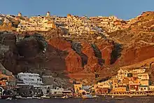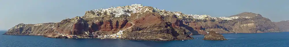 It is built on the steep slope of the caldera and the houses and restaurants are built into niches carved into the caldera on the seaward side. There are narrow passageways and a central square.[6] The sun light hours in this village are much longer than in the Fira town. Its paths are very narrow and hence get congested during the tourist season.[6][2] The idyllic surroundings of the town have a complex of white washed, blue domed churches and charming, traditional Cycladic houses and cave houses that are carved into the rock face on top of the cliff. It is set in a location which provides excellent views of the sunset over the caldera.[2][14] To the southwest, the Bay of Armeni, reachable from the town on foot or by mule, was once an important boatbuilding centre. Small repairs are now done on a single wharf. Excursion boats for trips around the island and ferries to Therasia leave from here. The harbour of Ammoudi on the western side of the town is reached by steep stairs north of Fort Londsa; there are a few tavernas and a pebble beach.[6][2]