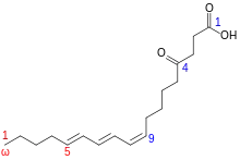 The fat components of oiticica oil are polyunsaturated α-licanic acid (46 – 78% of total), saturated fat mainly palmitic and stearic acids (together, 11%), monounsaturated as oleic acid (4 – 12%).[2][3]