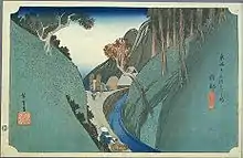The classic ukiyo-e print by Andō Hiroshige (Hōeidō edition) from 1831–1834 depicts a mountain stream between steep green banks, with the roadway a narrow path walled in on one side by a stone wall.