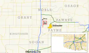 SH-86 begins at SH-51 in western Payne County, approximately 3+12 miles (5.6 km) east of Interstate 35. From this intersection, SH-86 heads north, crossing Stillwater Creek, just west of where it expands to form Lake Carl Blackwell, around two miles (3.2 km) north of SH-51.[3] SH-86 crosses into Noble County 3.01 miles (4.84 km) into its journey.[1] In Noble County, the highway mostly follows a due north course, except for a slight curve approximately two miles (3.2 km) south of Perry. The route passes just west of Lake Perry. Shortly thereafter, SH-86 comes to an end in Perry at US-77.[3]