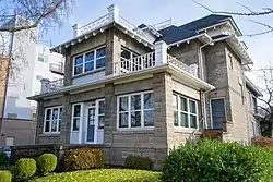 The first Alpha Tau Omega fraternity house in Eugene, Oregon is a 2.5-story building in the craftsman style completed in 1910. The wood-frame, hip roof building was constructed by Eugene blacksmith George Lill and features seven varieties of decorative cement blocks applied to the exterior surface. Lill manufactured the blocks himself by a process meant to simulate fine ashlar stone masonry.[1]
