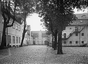 The complex surrounds a cobbled interior courtyard with large trees. A free-standing building in the courtyard dates from 1750.[5]
