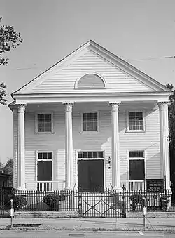 After the structure was relocated, the congregation had a portico added, supported by four fluted columns. The columns have modified Corinthian-type capitals. The galleried interior is plainly finished.