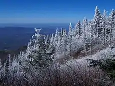Old Black gets its name from the dense Southern Appalachian spruce–fir forest that covers its higher elevations.[7] From afar, this forest takes on a dark green character, especially in cooler months when contrasted with the brown hardwood forest in lower elevations. This forest also adds to Old Black's blunt appearance—that of a low pyramid with a wide base.