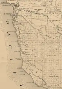 The Old Coast Road is a dirt road that still exists in part and preceded the current Big Sur Coast Highway along the northern coast of Big Sur, California. It was initially a trail created by Rumsen and Esselen Native Americans to travel along the coast in present-day Monterey County, California. Soon after the Spanish arrived, Governor Teodoro Gonzalez granted land that included portions of the trail as Rancho San Jose y Sur Chiquito to Marcelino Escobar in 1835. Governor Juan Alvarado re-granted the land to Escobar the same year. The Rancho included land from Carmel to near Palo Colorado Canyon. José Castro gained possession of the land in about 1848. He improved the trail from Monterey to Palo Colorado Canyon as early as 1853. A hand-drawn map created c. 1853 accompanying the grant indicated a road or trail was already present along the coast.[1][2][3][4]