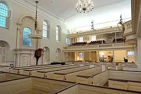 The meeting house or church was completed in 1729, with its 56 m (183 ft) steeple. The congregation was gathered in 1669 when it broke off from First Church of Boston, a Congregational church founded by John Winthrop in 1630. The site was a gift of Mrs. Norton, widow of John Norton, pastor of the First Church in Boston.[3] The church's first pastor was Rev. Thomas Thacher, a native of Salisbury, England. Thacher was also a physician and is known for publishing the first medical tract in Massachusetts.