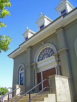 Window placement on the other four sides is irregular. The east side still has its original wrought iron fire escape. An additional entrance, to the building's basement, is found on the south side. On the west side, a small jail wing of similar material, built shortly after the completion of the town hall, is the building's only addition.[1]