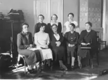 The agricultural instructors. Standing at rear left to right: Oksana Duchyminska, Kharytya Kononenko, Maria [?]. Seated in front from left to right: Irena Pavlykovska, Olena Shtogryn (from America), Olena Kiselivska, Irena Dombchevska and Olena Stepaniv-Dashkevych.