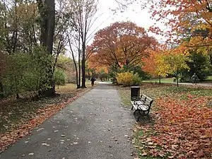 Following completion of the Emerald Necklace Parks Master Plan in 1989 (updated in 2001),[2] a number of improvements have been made in Olmsted Park. Riverdale Parkway, originally designed as a carriage road, was transformed into a bicycle and pedestrian path in 1997–98.[3] The Allerton Overlook at the foot of Allerton Street in Brookline was recreated, footbridges re-pointed, and a boardwalk placed at the south end of Wards Pond.