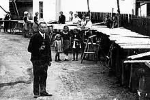 Dairy owner Emil Langer with his daughters and employees. In the back are tables for sun drying of the cheese.