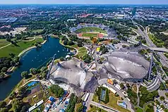 Olympiapark in 2018 with ensemble Olympiahalle (right), Olympic Swim Hall (left) and Olympic Stadium