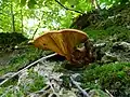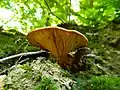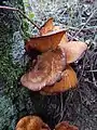 Omphalotus olearius,[2] commonly known as the jack-o'-lantern mushroom, is a poisonous orange gilled mushroom that to an untrained eye appears similar to some chanterelles. It is notable for its bioluminescent properties. It is found in woodland areas in Europe, where it grows on decaying stumps, on buried roots or at the base of hardwood trees. It has also been reported from the Western Cape Province, South Africa. A similar, but phylogenetically distinct[3] species found in eastern North America is Omphalotus illudens.