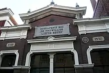 The fund was founded on February 12, 1719 as a "begrafenisbos" or funeral insurance firm.[1] The old name was "Begrafenisbos De Vrijwillige Liefdebeurs", with the motto "In Alles Ghetrou" (faithful in everything).[2] This is the name that is on the facade of the building, which was designed in 1870-1871 by the Haarlem architect Adrianus van der Steur (1836-1899).[1] The company was first located at the neighboring building, Korte Begijnestraat 16. After an argument with the neighbour, a baker whose oven "made the meetings of the society overheated", the company decided to solve the mutual problem between the neighbour and the fund by buying the neighbour's house. That house was bought and then renovated to create the current building.[1] The building is currently located between the Toneelschuur and the Hofje van Bakenes. On occasion of the 300th anniversary of the firm, the Haarlem Opera staged an opera, named De Liefdesbeurs, dedicated to the firm.[3]