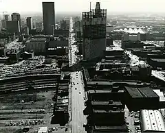 There was once a restaurant on the 38th floor called One Nation, which opened in November 1977. The glass elevator on the side of the building is an express elevator that was designated for customers going to the restaurant. One Nation closed in 1997 after '[failing] to come to terms with the building's owner'.[2] The glass elevator is no longer in service.