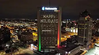 The building was designed by Brubaker/Brandt (the same firm that designed Rhodes State Office Tower, the tallest building in Columbus) and Harrison & Abramovitz.[1] The façade is dark vertical steel ribs bordered by white limestone ends which follows the modernist style. Blue spotlights light the exterior at night in the same color of Nationwide's logo. In December the interior lights are set so that it reads "happy holidays" to observers of the building, with thematic messages similarly displayed during other holidays and special events such as Columbus Blue Jackets and Ohio State Buckeyes victories and accomplishments.