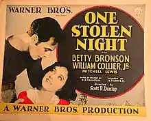 One Stolen Night is a 1929 American sound part-talkie adventure crime film directed by Scott R. Dunlap, and starring Betty Bronson, William Collier Jr., Mitchell Lewis, Harry Todd, and Charles Hill Mailes. In addition to sequences with audible dialogue or talking sequences, the film features a synchronized musical score and sound effects along with English intertitles. The soundtrack was recorded using the Vitaphone sound-on-disc system. The film is based on the short story The Arab by D. D. Calhoun. It is a remake of the 1923 film with the same name. The film was released by Warner Bros. on March 16, 1929.[2][3][4]