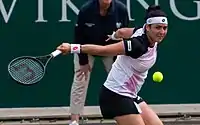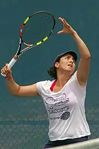 Jabeur stayed inside the top 200 for most of the next three years, but could not enter the top 100, reaching a career-best ranking of 118 in 2015.[15] She continued to play a mix of ITF and WTA events, but played primarily at the ITF level.[14] Her only ITF title in 2014 came at a $25k event in Tunis, and she did not win any titles in 2015.[12] She finished runner-up twice in 2014, with the higher-level result coming at the $50k Open Nantes Atlantique, losing to Kateřina Siniaková. After losing in qualifying at the French Open and Wimbledon, Jabeur qualified for two major main draws in a row at the 2014 US Open and the 2015 Australian Open. She lost her opening matches at both tournaments to No. 19 Andrea Petkovic and Vera Zvonareva, respectively. With no titles, finals, or semifinals in 2015,[14] her year-end ranking dropped to No. 210.[15] Jabeur rebounded with two $25k titles in January 2016. A $50k title at the Nana Trophy in Tunis helped her return to the top 200 for all but one week through the rest of the season.[15][20] Nonetheless, she lost in qualifying at both Wimbledon and the US Open and did not have a strong second half of the season.[14] She finished the year at No. 193.[15]