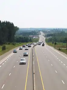 Plans for four-laning Highway 11/17 from the end of the Thunder Bay Expressway northwest to Nipigon, including the Nipigon River Bridge, were first announced in December 1989.[121] The corridor was divided into four segments, and an Environmental Study Report (ESR) was published for each in 1996 or 1997.[122][123] While the MTO designated the corridor—a mix of twinning the existing highway and a new alignment—in 2003,[123] funding wasn't committed to the project until the late 2000s. In early-to-mid 2009, the provincial government announced the first of several contracts to expand the highway, starting from the Thunder Bay end. Construction on the 4.4-kilometre (2.7 mi), $42-million contract began in August 2010, from west of Hodder Avenue to Highway 527.[124] The westbound lanes opened the weekend of August 6, 2011;[125] the existing highway was then rebuilt as the eastbound lanes, and opened on August 17, 2012. An interchange at Hodder Avenue—the first in Northwestern Ontario—was included as part of this project[126]