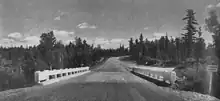 Initially this road was designated as Highway 120. In 1959, it was decided to make this new link a westward extension of Highway 11. On April 1, 1960, Highway 11 assumed the route of Highway 120; this consequently created a concurrency of Highway 11 and 17 between Nipigon and west of Thunder Bay.[66][67][68] Now reaching as far as Atikokan, construction of a road between there and Fort Frances was carried out over the next five years. The final link, the 5.6-kilometre (3.5 mi) Noden Causeway over Rainy Lake, was opened on June 28, 1965, after which Highway 11 was extended to Rainy River and the American border.[69] Highway 11 was now at its peak length of 1,882.2 kilometres (1,169.5 mi).[70]