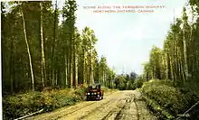 The route of the new road between North Bay and Cobalt was cleared by April 1925,[38] after which construction began in August from both North Bay as well as Cobalt.[39] The new gravel highway was officially opened on July 2, 1927,[37] by Minister of Lands and Forests William Finlayson. He suggested at the opening that the road be named the Ferguson Highway in honour of premier Ferguson. The name was originally suggested by North Bay mayor Dan Barker.[40] Despite the official opening, a section between Swastika and Ramore wasn't opened until August.[41] The Ferguson Highway name was also applied to the Muskoka Road between Severn Bridge and North Bay.[37] Although the route from North Bay to Cochrane was passable, it was not an adequate road in many places. Construction continued for several years to build bypasses of sharp turns, steep grades, awkward rail crossings, and other obstacles. The Ferguson Highway was extended from Cochrane to Kapuskasing by 1930, and later to Hearst in 1932.[42][43]