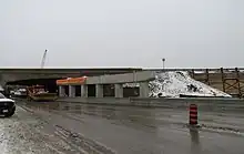 Construction began north of Barrie in April 2013 to replace the overpass at the Crown Hill junction with Highway 11.[52] The new structure, designed to accommodate future highway expansion, was completed in October 2015. The original overpass, built during the 1950s, was demolished during an overnight closure on December 13, 2015. The overall cost of this project was C$8.5 million.[53][54]