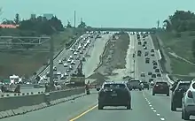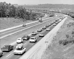 Highway 400, along with Highway 401 and Highway 402, was one of the first modern freeways in Ontario. Planning for the Toronto–Barrie Highway, which would become Highway 400, began in 1944.[1] The two routes connecting Barrie with Toronto at the time, Highway 11 and Highway 27, were becoming congested. Grading on a new alignment between Weston Road and Jane Street was completed from Wilson Avenue to Highway 27 (Essa Road) by 1947.[3] The onset of the Korean War slowed construction on the highway considerably,[14] and it wasn't until December 1, 1951 that two lanes (one in each direction) would be opened to traffic. All four lanes were opened to traffic on July 1, 1952, at which point the highway was designated Highway 400.[15] The name was the scorn of one newspaper editor, who published his distaste for using numbers to name a highway.[16] The freeway featured a 9.1 m (30 ft) grass median.[17]