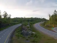 At Craighurst the highway again turns north-east, skirting the Copeland Forest and the ski hills of the Oro Moraine, to meet Highway 12, which runs concurrently with the 400 between Exits 141 and 147, in Coldwater.[11] From here, the highway takes on the Trans-Canada Highway designation, and follows a predominantly north-western heading along what was the route of Highway 69, toward the planned terminus of Sudbury.[12] In Muskoka and Parry Sound Districts, Highway 400 is in most sections a twinned four-lane highway,[8] but several bypasses have and are being built to circumvent the communities along the way.[12][13] At Port Severn, the highway meets the rugged Canadian Shield, and winds its way north through the granite, often flanked by towering slabs of rock.[8]