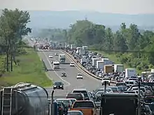 From Highway 401 to the Holland Marsh the freeway largely parallels the arterial/concession roads Weston Road and Jane Street, passing over the height of land at the Oak Ridges Moraine.[9] The highway passes through protected rural areas in northern York Region and encounters rolling countryside in Simcoe County south of Barrie.[8] Between Major Mackenzie Drive and King Road, Highway 400 features HOV lanes which have acceleration/deceleration lanes at entry/exit points.[10] Just a bit north of the Simcoe Road 88 exit, Highway 400 will meet the future Bradford Bypass. The section near Barrie is subject to snowsqualls as it lies near the edge of Georgian Bay's snowbelt.