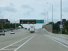 Highway 402 was widened in the Sarnia area from four to six lanes due to extensive traffic backups from the bridge crossing towards the USA; the westbound lanes were widened by two lanes, while eastbound capacity remains unchanged. The new four-lane roadway is divided into specific lanes for cars, trucks, local traffic, and NEXUS card holders.[45] The new lanes begin just before the Murphy Road overpass with a local lane breaking away for interchange access; all travellers wishing to exit the highway from this point must be travelling in this lane.[46] Construction began August 4, 2009,[24] between the Blue Water Bridge and Lambton County Road 26 (Mandaumin Road) and included the reconstruction of several bridges, as well as completely rebuilding the Christina Street exit to accommodate southbound access. Work was completed by the end of 2012.[45][46] Between 2004 and 2013, the speed limit along the westbound lanes from Airport Road westward was reduced from the standard 100 kilometres per hour (60 mph). However, following the reconstruction, the speed limit was raised between Indian Road and Airport Road on June 20, 2013.[47]
