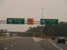Highway 402 begins on the Canadian side of the Blue Water Bridge.[3] Across the St. Clair River, Highway 402 continues in Michigan as I-69 and I-94.[4] The twin bridge crossing has six lanes of traffic and non-stop freeway access.[4] This provides a quicker route than the busier Ambassador Bridge crossing in Windsor, which features over ten traffic lights leading to the four-lane bridge, although that situation is expected to be rectified after the planned Gordie Howe International Bridge is constructed.[5][lower-alpha 1] Although Highway 402 passes through Sarnia, it is not intended to operate as a commuter highway; at Highway 40 and westward all ramps leading to the westbound lanes of the freeway were originally signed as "Bridge To U.S.A." without reference to Highway 402, though these have been replaced in the early 2000s with signs saying "402 West Bridge To U.S.A.".