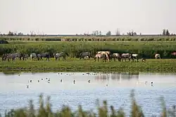 The Oostvaardersplassen (Dutch pronunciation: [oːstˈfaːrdərsˌplɑsə(n)]) is a nature reserve in the Netherlands, managed by the Staatsbosbeheer (state forestry service). Covering about 56 square kilometres (22 sq mi) in the province of Flevoland, it is an experiment[2][3][4] in rewilding.[5] It is in a polder created in 1968; by 1989, its ecological interest had resulted in its being declared a Ramsar wetland.[6] It became part of Nieuw Land National Park when that was established in 2018.