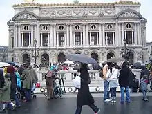 Opéra (French: [ɔpeʁa] ⓘ) is a station on Line 3, Line 7 and Line 8 of the Paris Métro. It is named after the nearby Opéra Garnier. Located at the end of the Avenue de l'Opéra, it serves the district of Boulevard Haussmann. Its main entrances are located on the Place de l'Opéra, built in a marble design (instead of the characteristic iron metro entrances of Hector Guimard), to not spoil the view of the opera house.