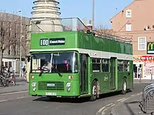 Buses continued to operate sea front services. These used conventional vehicles with roofs, although by this time some seaside resorts were operating similar services with open top buses.[6] It was 1950 before open top buses appeared on service 152 (as it was known) between the Sanatorium and Old Pier. Three old vehicles of a type not usually found in the fleet had their roofs cut off and were painted cream and green. They proved popular with passengers but were replaced after a year or two-year with more conventional Bristol buses which had their roofs removed.[7]