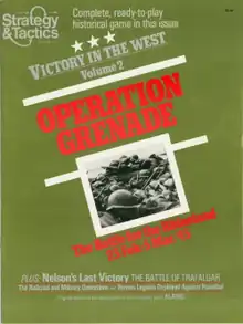 Operation Grenade, subtitled "The Battle for the Rhineland 23 Feb. – 5 Mar. '45", is a board wargame published by Simulations Publications Inc. (SPI) that simulates the crossing of the Roer river between Roermond and Düren by the U.S. Ninth Army in February 1945, which marked the beginning of the Allied invasion of Germany. This was the second of three wargames using a common set of rules in the "Victory in the West" series.