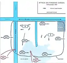 On the morning of 15 November three companies of the 3rd Battalion, 47th Infantry Regiment, were lifted by helicopters into the southern part of the Kien Giang zone to secure a firebase. The companies established Firebase Cudgel (10°25′11″N 105°59′28″E / 10.4198°N 105.991°E) in swampy rice paddy at the intersection of the So Bay Canal and the Ong Tai Creek.[2] At 09:00 CH–47s delivered Battery C, 2nd Battalion, 4th Artillery Regiment and experimental firing platforms for each of the 6 105 mm howitzers into Cudgel. Battery D was also airlifted in later that day.[1]: 131